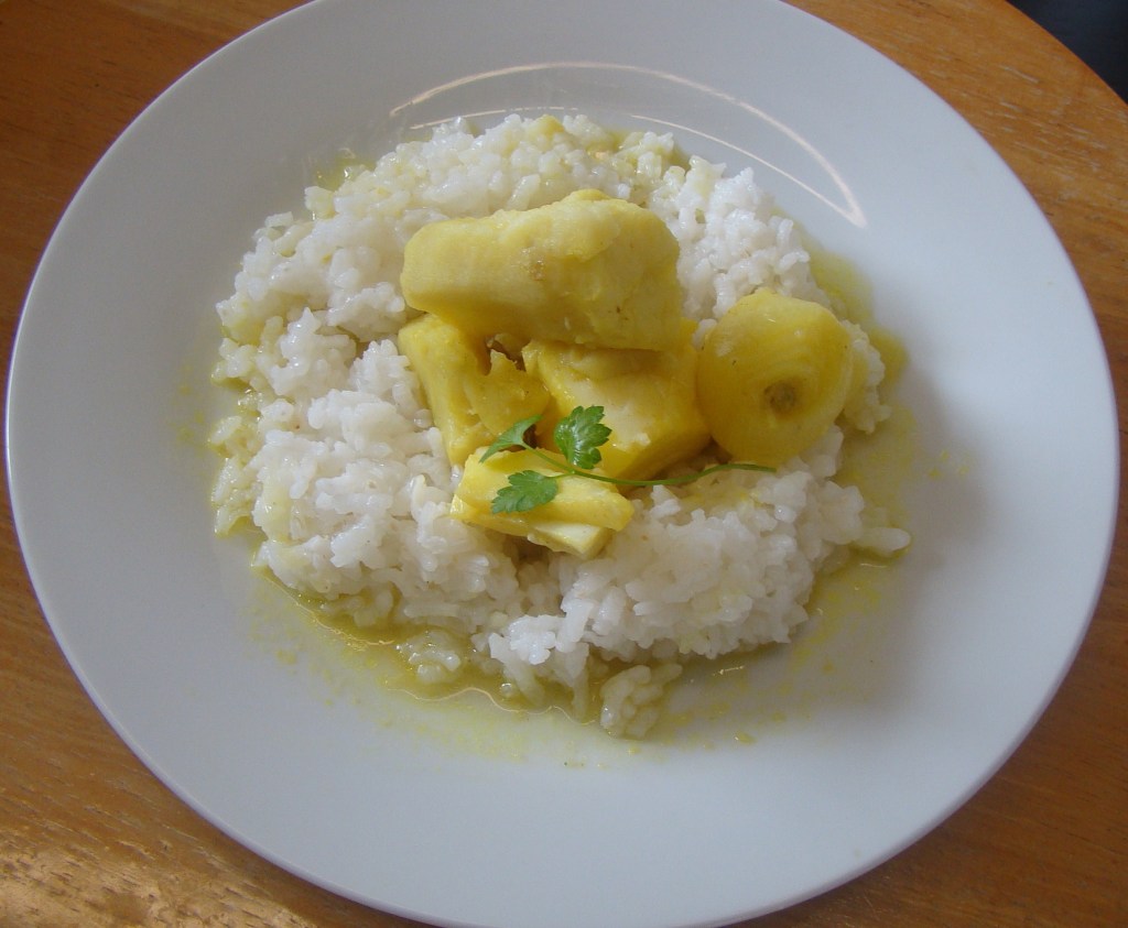 INGREDIENTES: 1 taza de arroz, 1 cebolla, 3 dientes ajos, 1 trozo de bacalao, 1 cucharada de aceite de oliva, 1/2 cucharadita de curry, 1 batata blanca y sal al gusto.