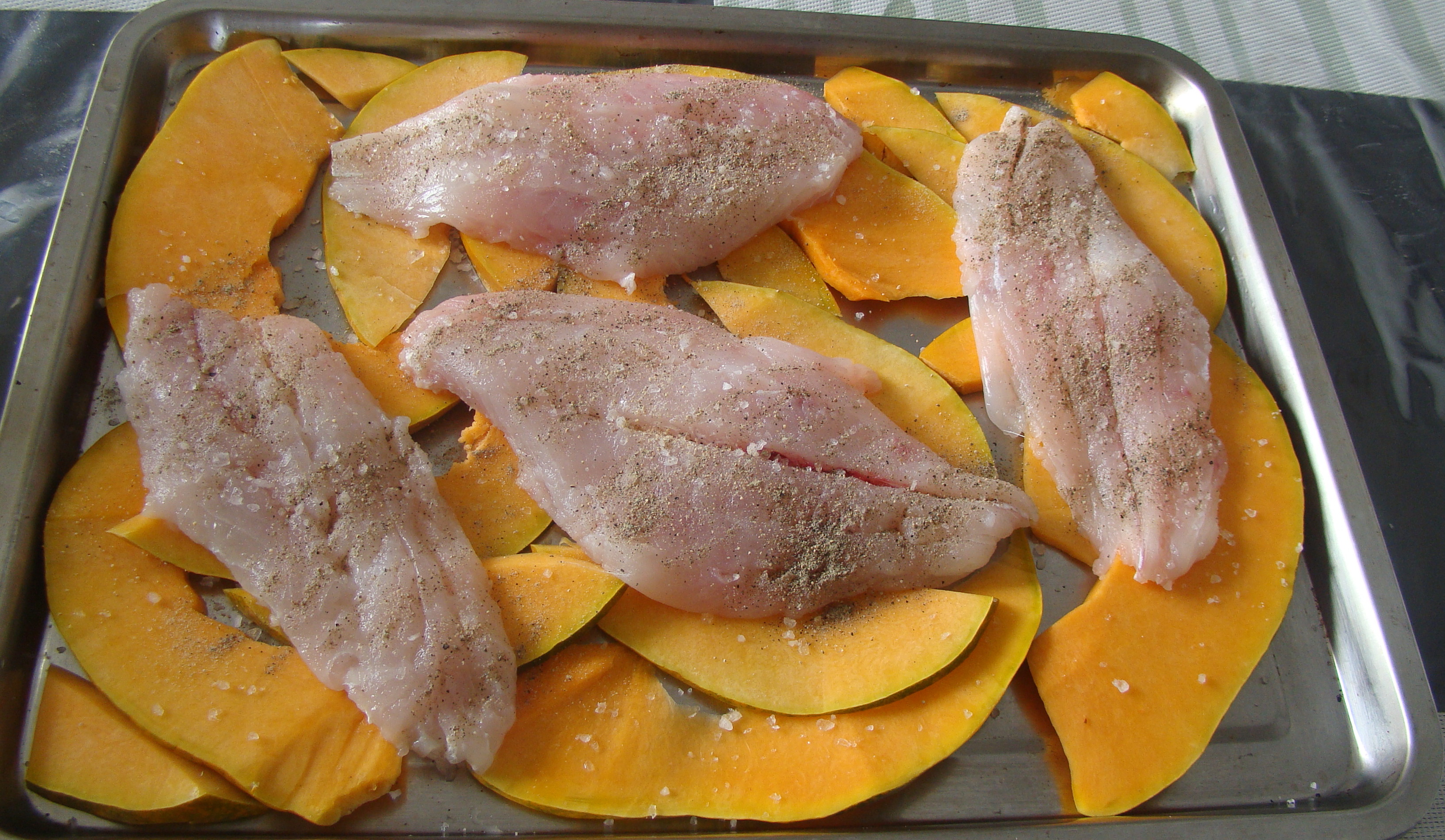 PREPARACIÓN: en la bandeja de horno, ponemos la calabaza cortada en láminas finas sin quitarle la piel, encima el lenguado con las especia y el aceite. Con el horno caliente, ponemos 10 minutos apagamos 5 minutos más y sacamos. (a 180 grados)