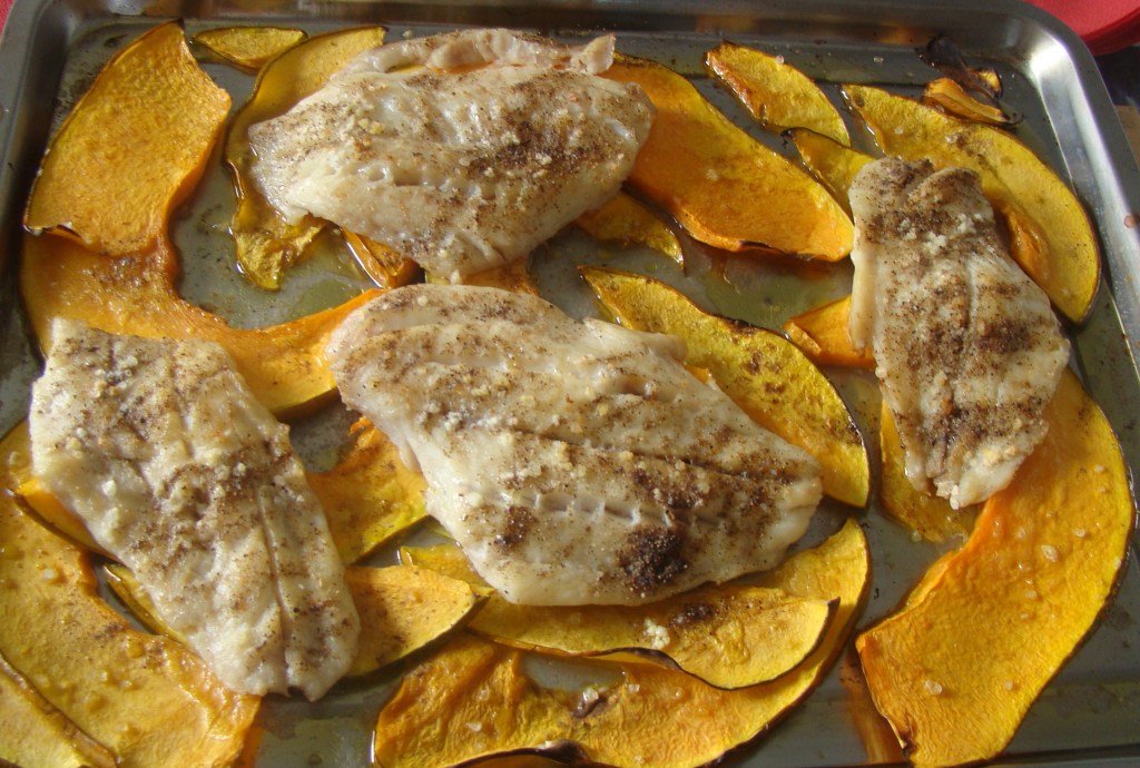 PREPARACIÓN: en la bandeja de horno ponemos la calabaza cortada en tiras finas, encima el lenguado, el aceite y las especias. Horneamos a 180ª durante diez minutos ( el horno debe estar caliente antes de poner el lenguado).
