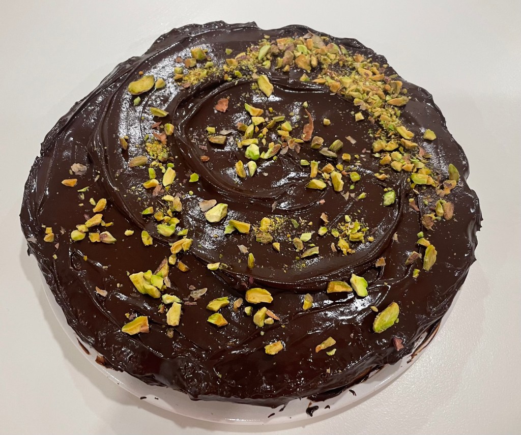 Hicimos dos por el número de comensales y las decoramos. En una usamos azúcar glas y pistachos y en la otra usamos chocolate para fundir y pistachos.