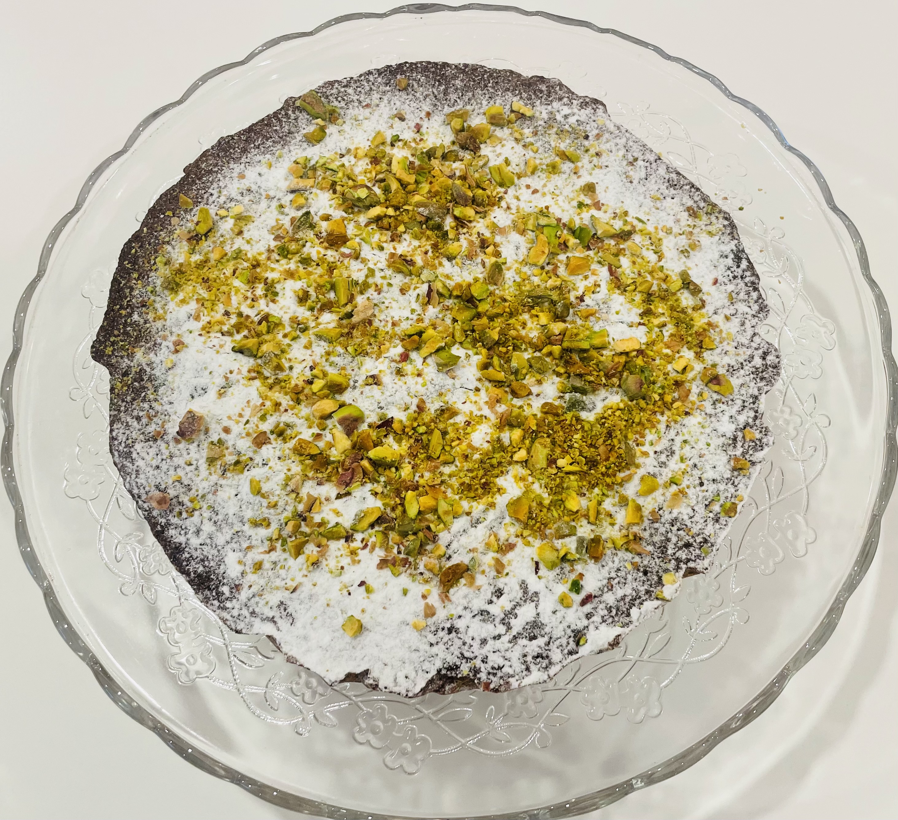 Hicimos dos por el número de comensales y las decoramos. En una usamos azúcar glas y pistachos y en la otra usamos chocolate para fundir y pistachos.