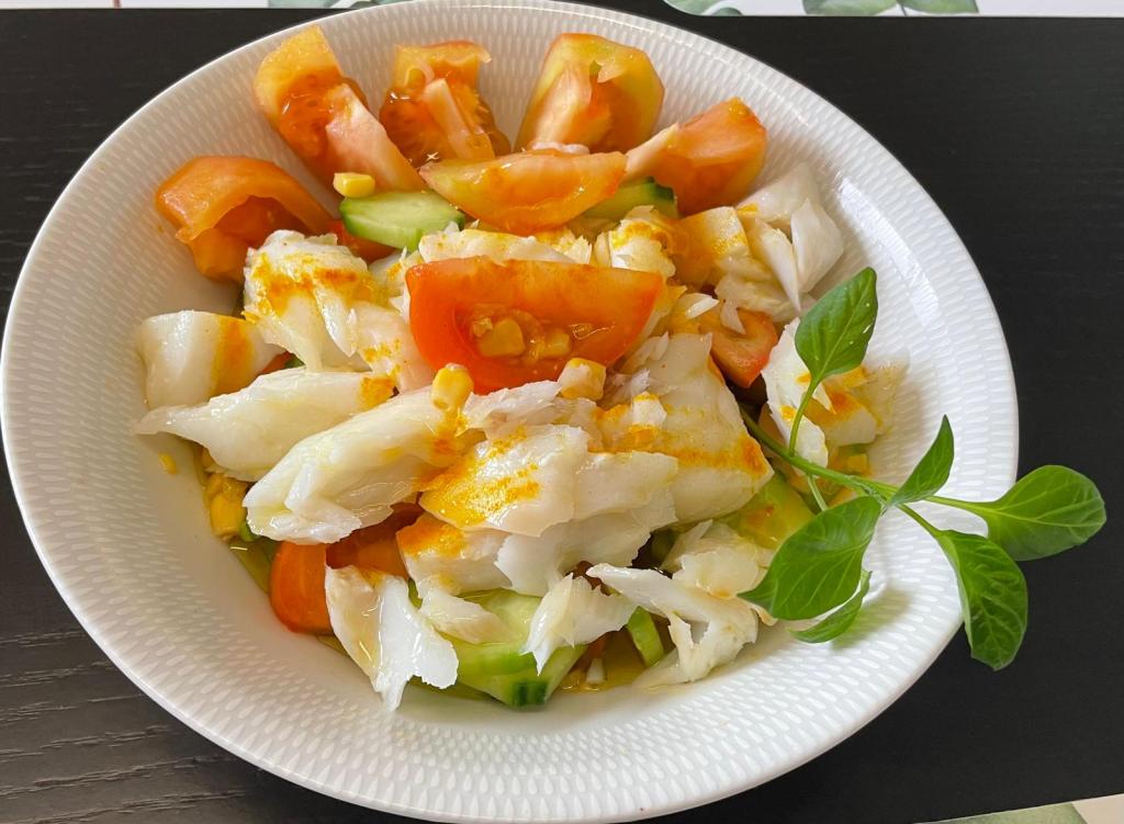 INGREDIENTES: 2 trozos de bacalao, aceitunas rellenas de anchoas, 1 lata de millo, pepino, aceite de oliva virgen, vinagre de manzana, una cucharadita de cúrcuma, 2 tomates.