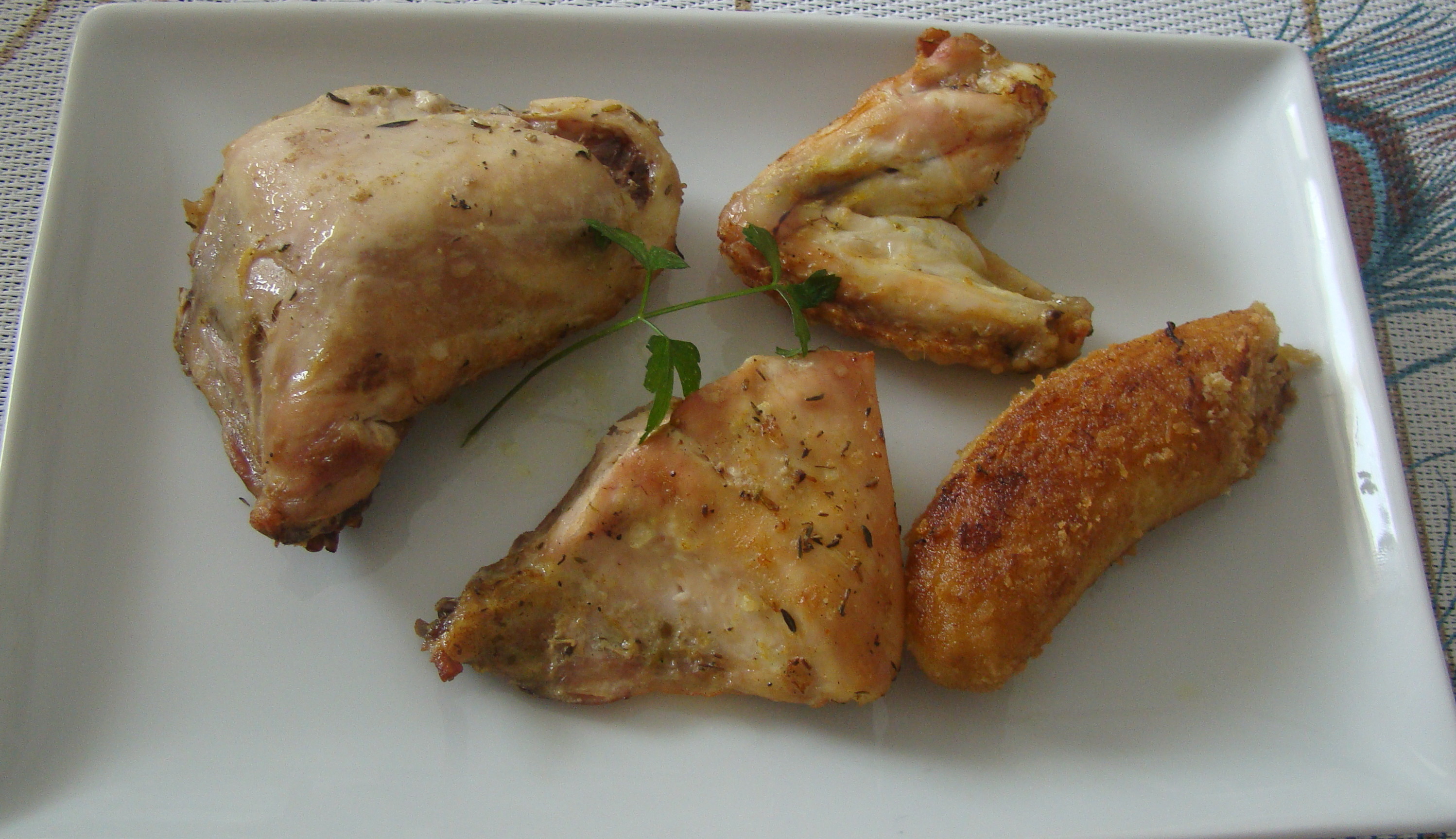 PREPARACIÓN: ponemos en un cuenco en maceración el pollo con el aceite, el brandy, la sal y las especias (el menos 30´) . Horneamos, con el horno ya caliente, a 180grados durante 15 minutos (dándole la vuelta, 15 minutos más de cocción) y acompañamos con plátanos fritos.