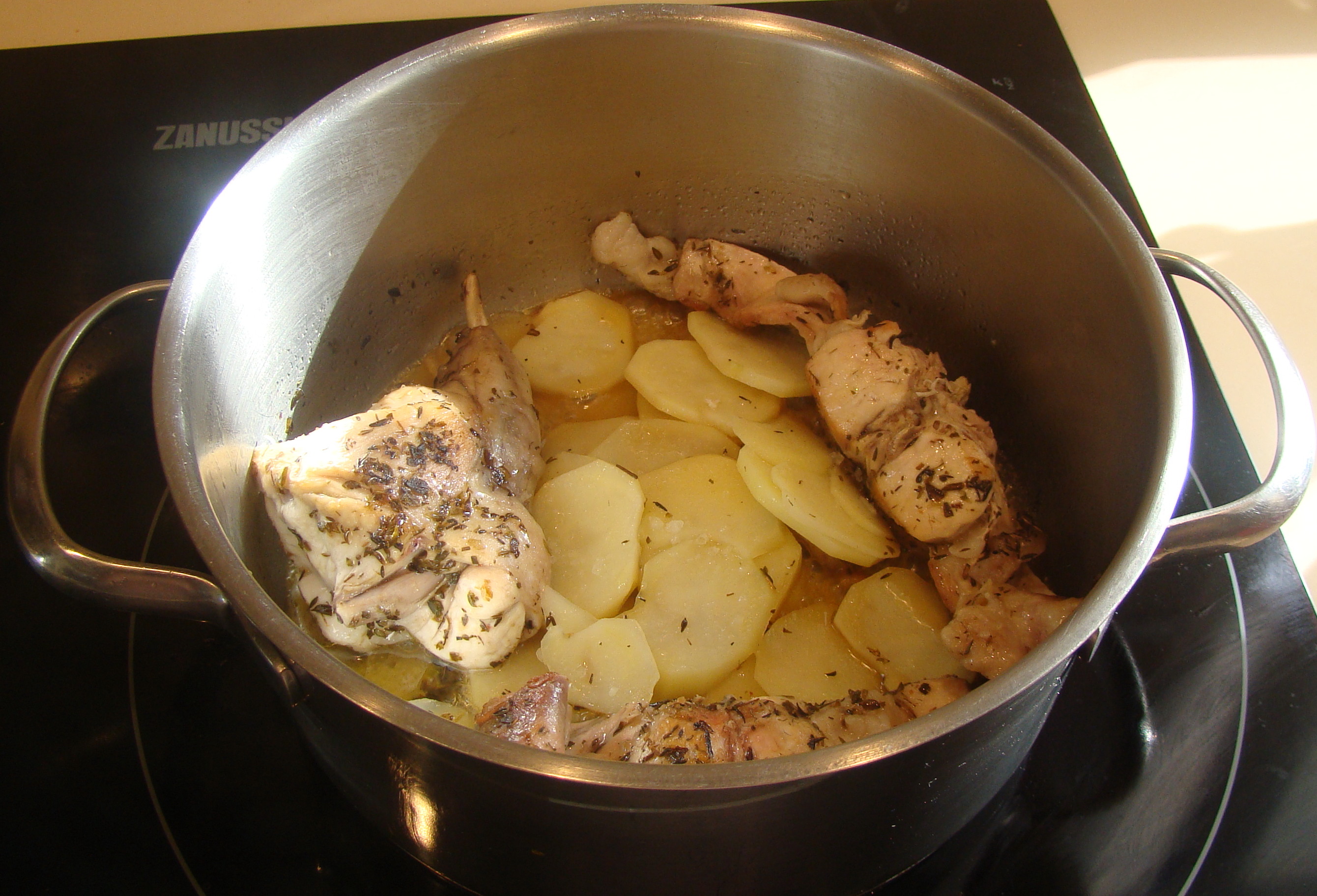 INGREDIENTES: un conejo troceado, 4-5 dientes de ajo, 2 cucharadas de aceite de oliva, 1 cucharadita de orégano, 1 cucharadita de tomillo, 1/2 vaso de Brandy, 1 cucharadita de pimienta blanca y sal al gusto, 1 kilo de papas y aceite para freír.