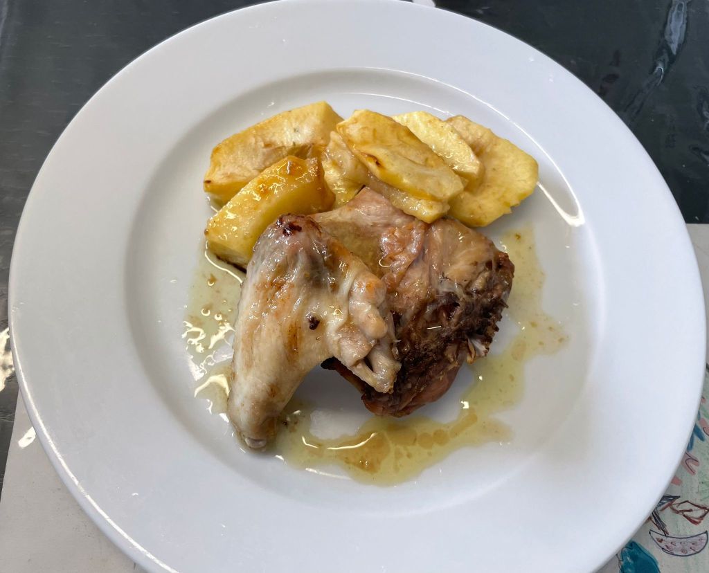 PREPARACIÓN: en una bandeja de horno ponemos el aceite, el brandy y las manzanas cortadas y encima el pollo troceado salpimentado al gusto por ambos lados (quedando las manzanas alrededor y debajo). Con el horno ya caliente, horneamos a 180 grados 15 minutos calor arriba y abajo. Ahora le damos la vuelta, y dejamos 15 minutos más. Podemos poner los últimos minutos (no más de 5 minutos) la función grill del horno para un acabado más crujiente.