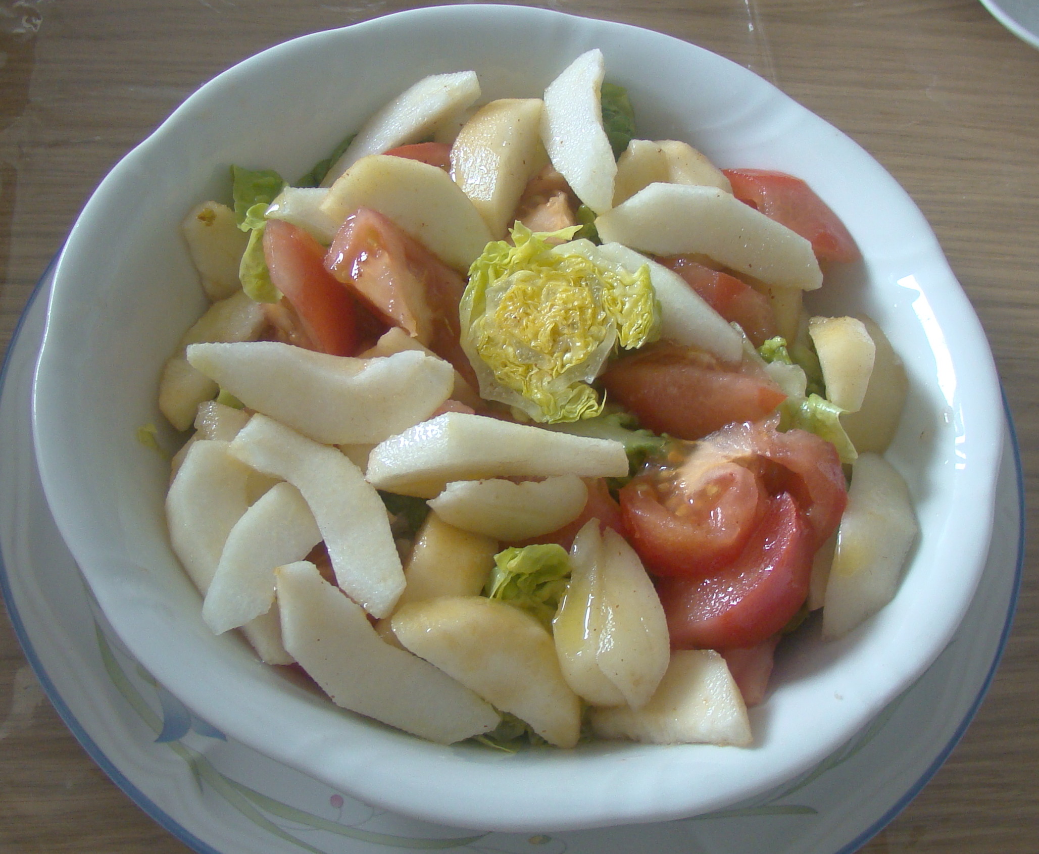 INGREDIENTES: lechuga, 2 tomates, 2 peras, aceite de oliva virgen y vinagre de manzana.