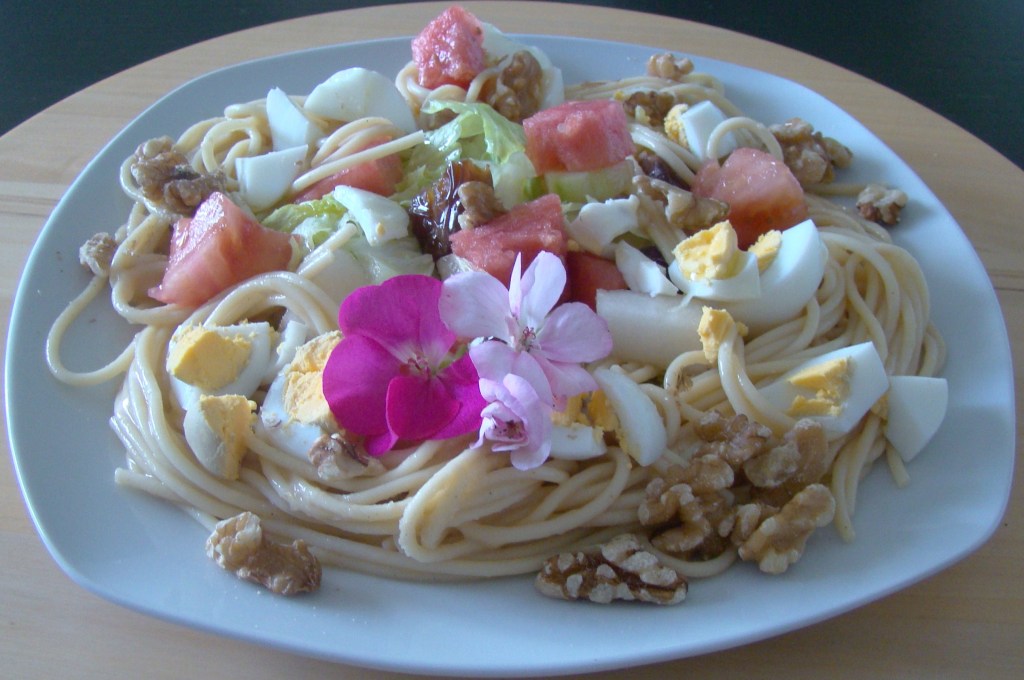 INGREDIENTES: 100 gramos de espaguetis, 1 trocito de melón, 1 trocito de sandia, 1 tomate, 6 dátiles, 2 cucharadas de nueces, 1/2 pepino, 3 huevos duros, 1 lechuga pequeña, el zumo de 1 limón y 2 cucharadas de aceite de oliva virgen.