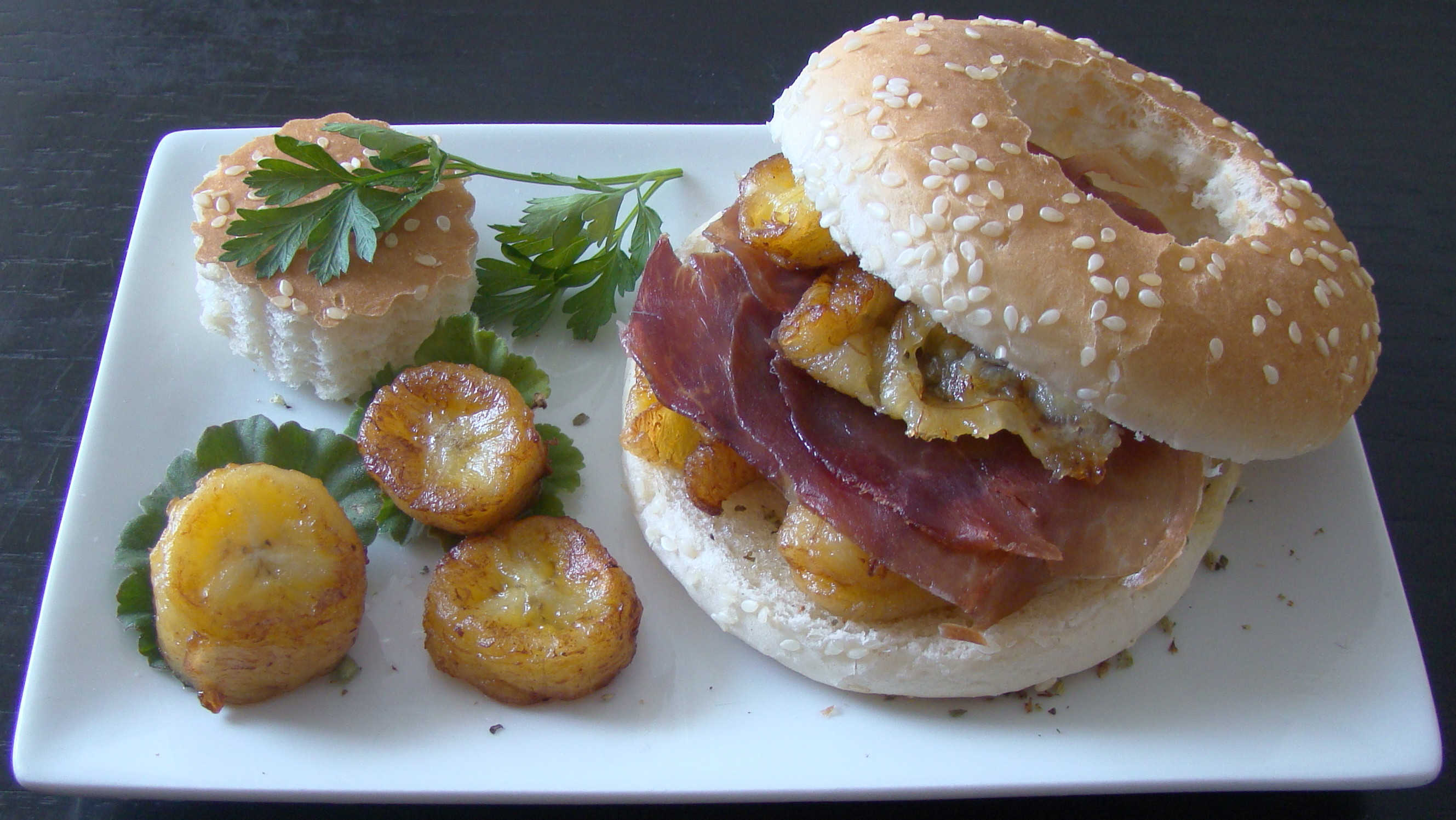 INGREDIENTES: lechuga, rodajas de queso de cabra tierno y queso de mezcla, 1 plátano, 3 fresas, aceite de oliva virgen y pan de hamburguesa.