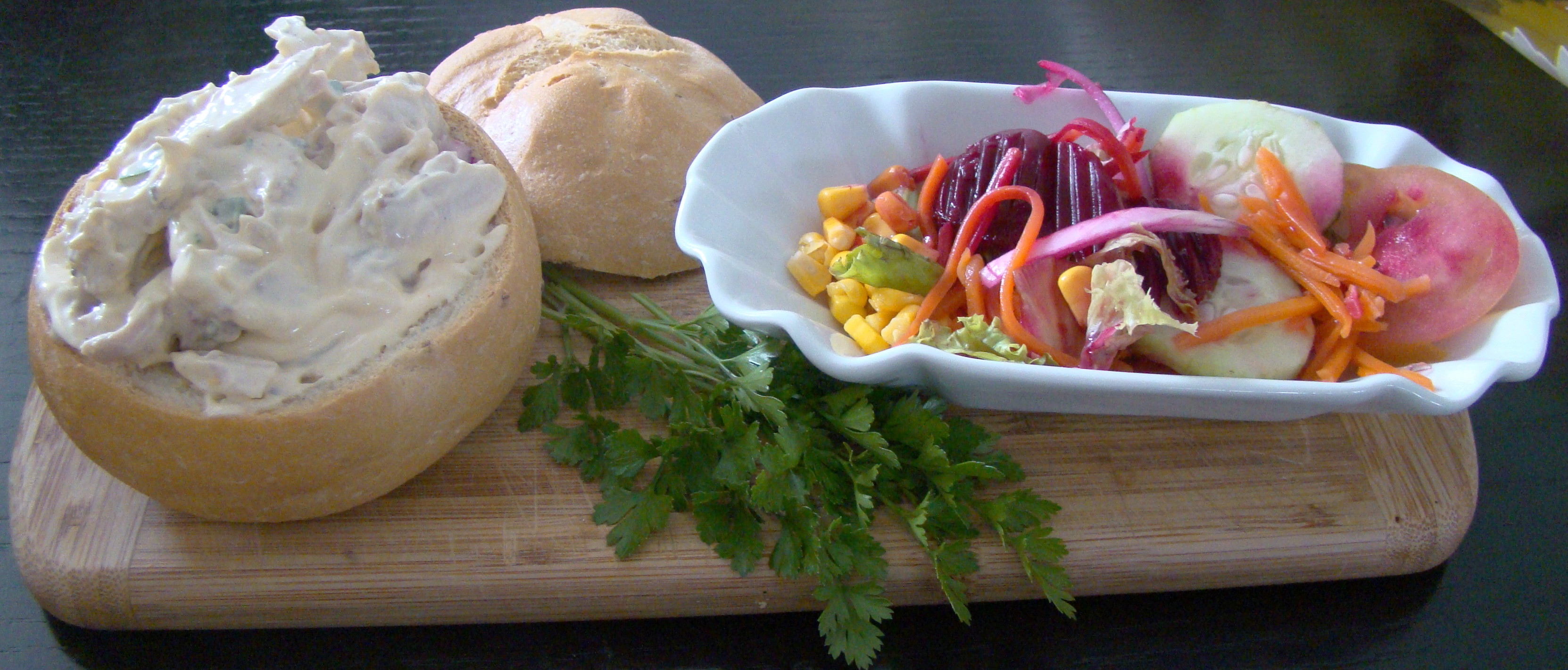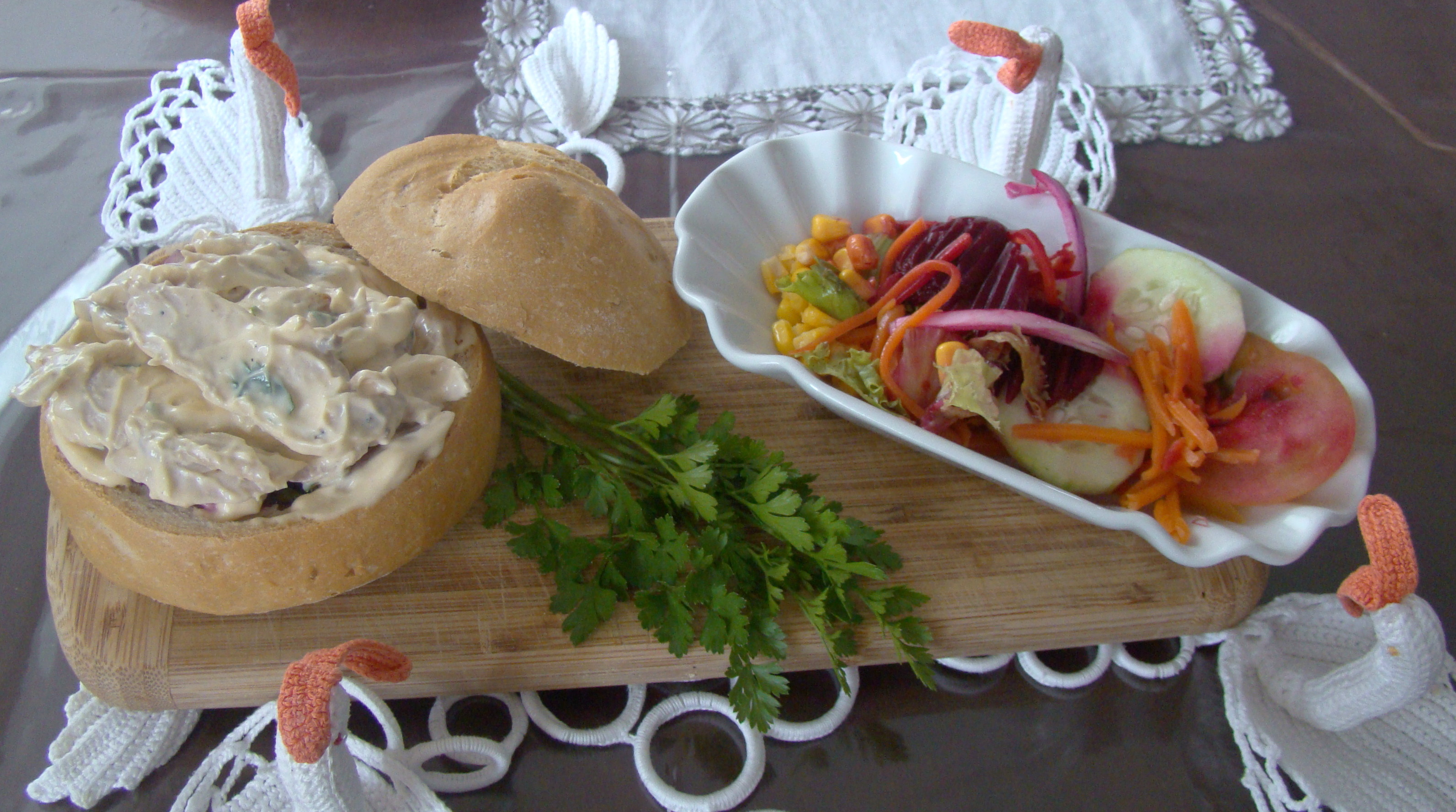 Para untar el pan utilizamos la salsa: mayonesa, perejil picadito, una cucharadita de aceite de oliva virgen, una cucharadita de zumo de limón mezclado con suavidad.