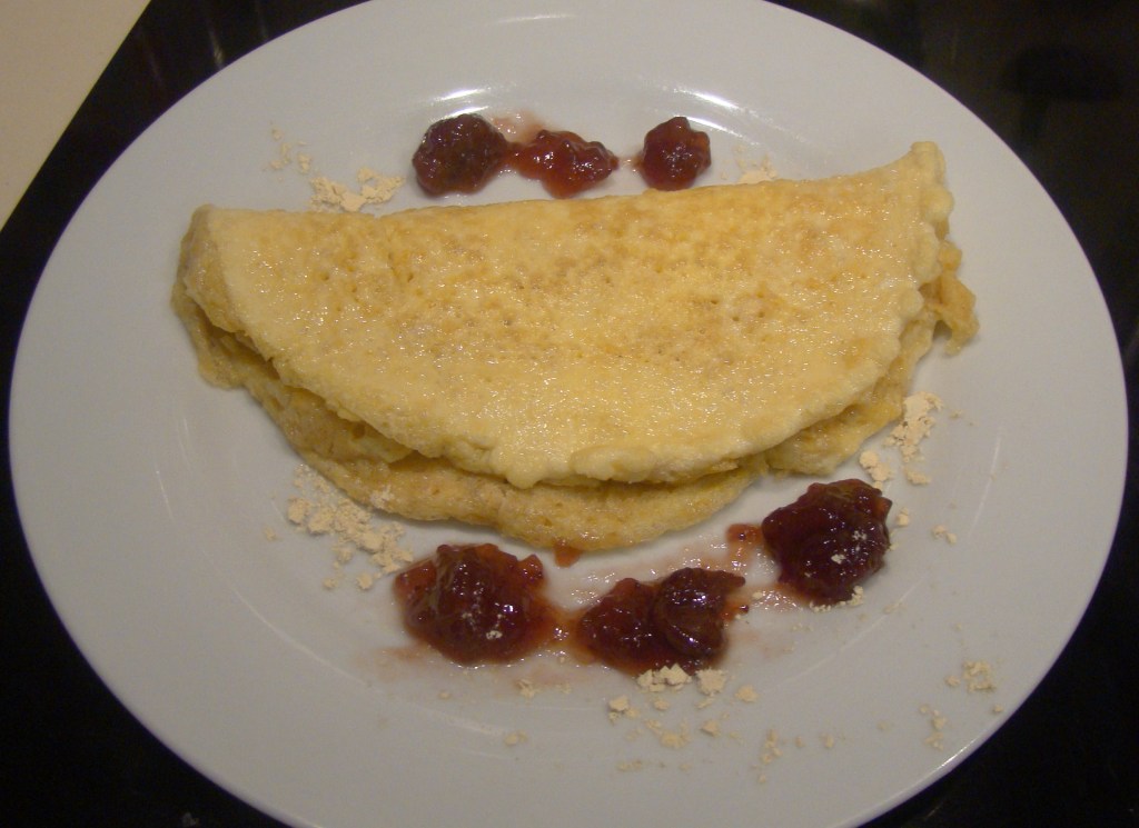 INGREDIENTES: 3 huevos, 1 cucharadita de agua, 1 cucharadita colmada de gofio de millo, mermelada de arándanos al gusto, y 1 cucharadita de aceite de oliva virgen.