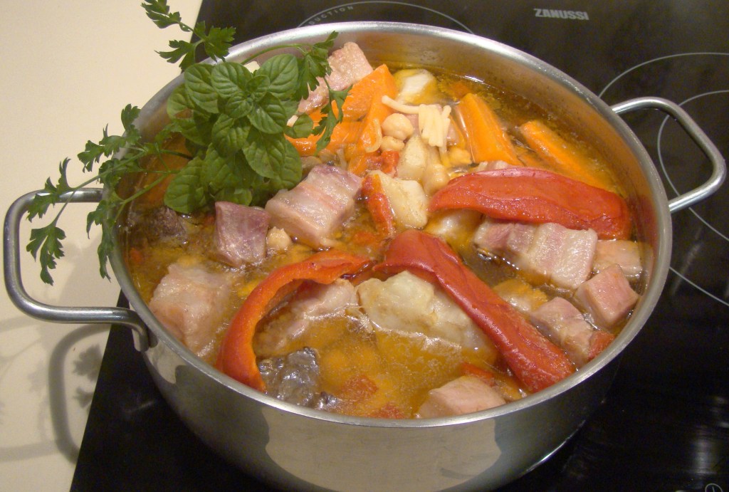 INGREDIENTES:1 vaso de garbanzos, 1 zanahoria, 1 cebolla, 1 trozo de puerro, 1 pimiento encarnado, carne de componer, costillas de cochino, 1 hoja de laurel, 1 vaso de fideos,1 cucharadita de aceite de oliva virgen y sal al gusto.