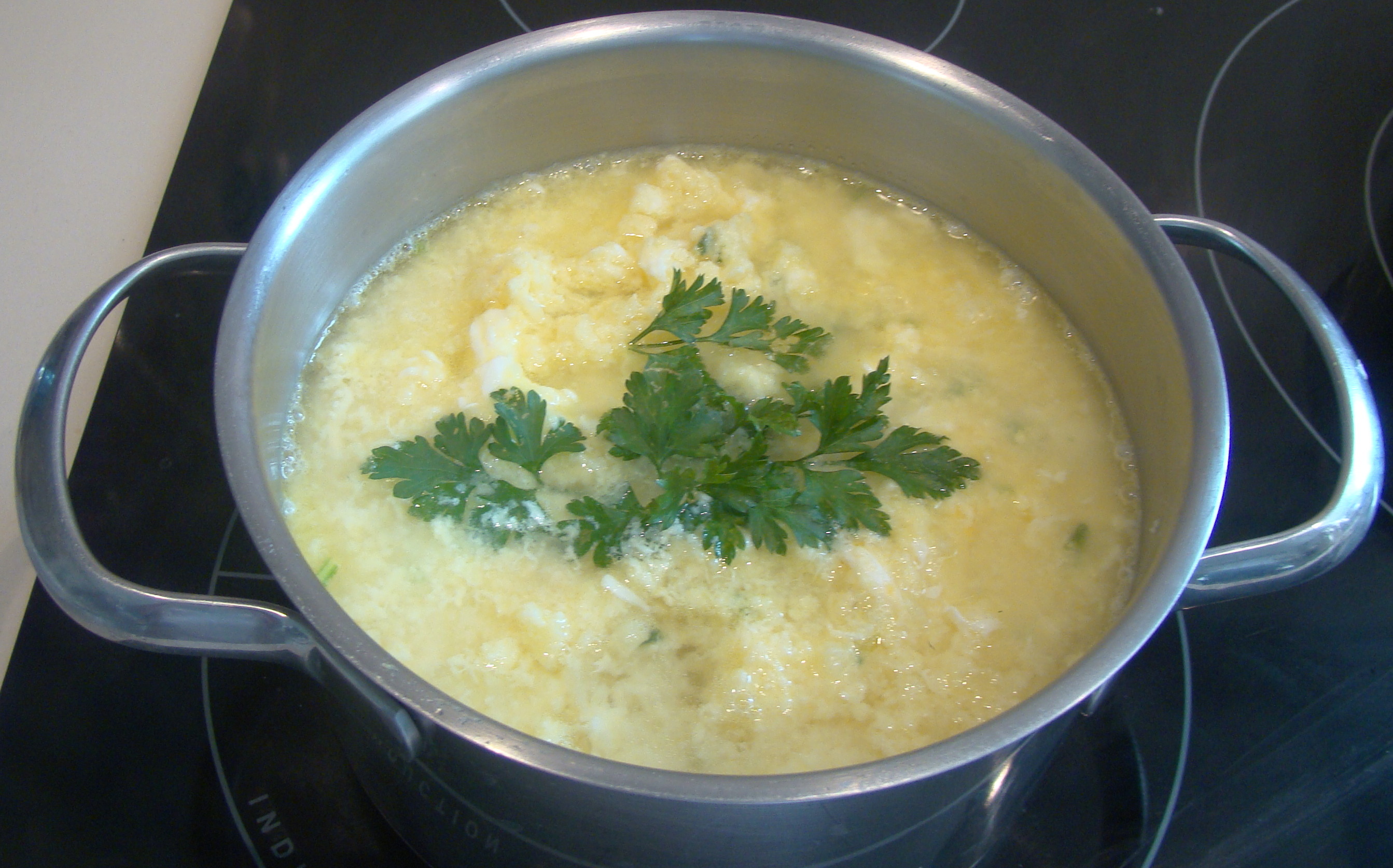 PREPARACIÓN: hacemos un sofrito en el caldero con la cebolla picadita y los ajos. Cuando estén pochaditas, añadimos las papas peladas y cortadas en 4, agua (la justa que las cubra) y sal al gusto. Cuando estén casi lista, añadimos los huevos sin batir y removemos. Añadimos perejil picadito y apartamos.